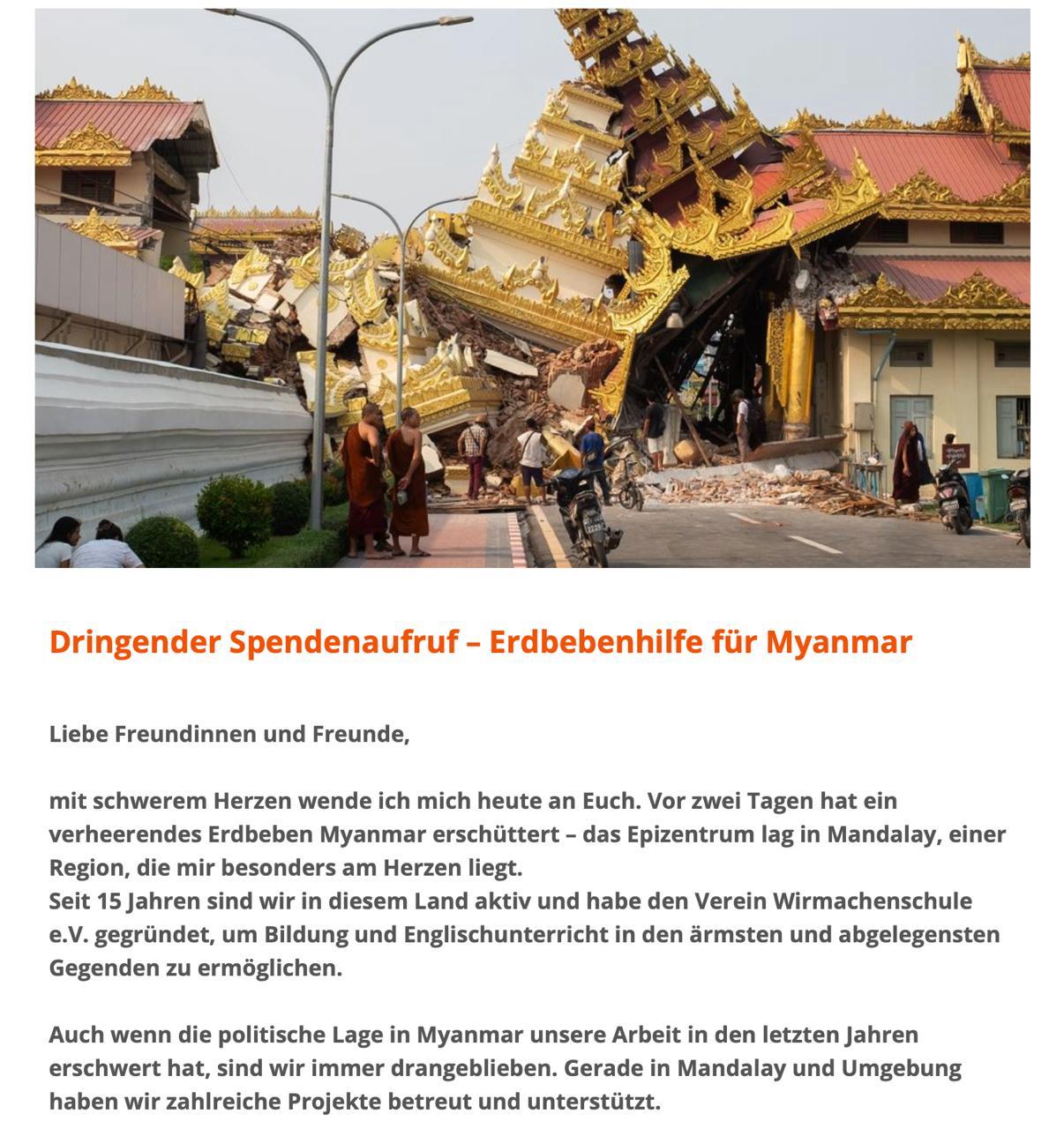 Nach dem dramatischen Erdbeben am 28. März 2025 werden aktuell alle Spendengelder über die Projekte für die Erdbebenhilfe verwendet, um die Menschen beim Überleben und Wiederaufbau zu unterstützen. Jeder Cent zählt!